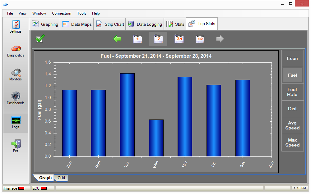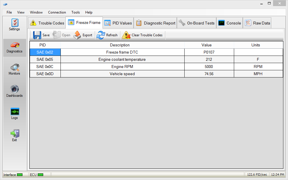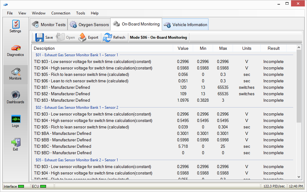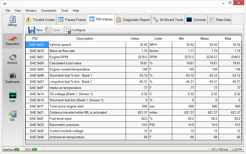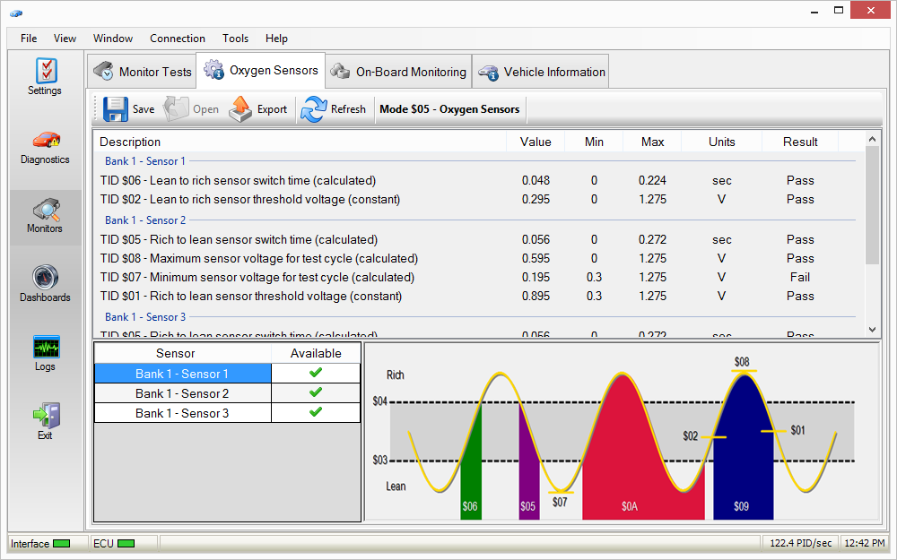 OBDwiz 支持 90 多个传感器 (PID),包括对氧传感器(模式$05)、车载监控(模式$06)和车辆信息(模式$09)的支持。 软件更新是免费的,可以直接从软件中下载。